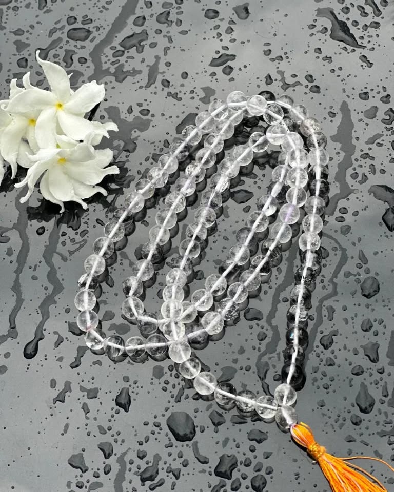 The natural cooling effect of crystal beads supports emotional balance, while its healing properties aid in reducing anxiety and physical discomfort. Spiritually, the mala is believed to connect the wearer with divine energy, opening the path for higher consciousness.