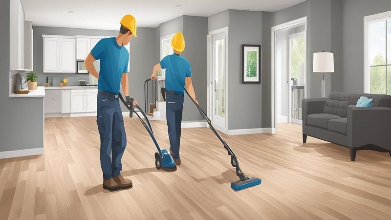 The team conducts a thorough cleaning of the newly installed floors. They remove all installation debris and protective coverings.