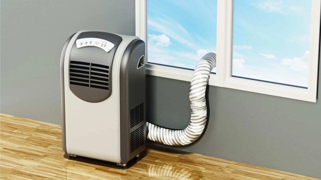 Portable air conditioners are small and flexible and can be moved from one room to another to cool down an area inside. These units have a fan, a condenser, and an evaporator all in one. They need to be plugged in and have a window for hot air to escape.